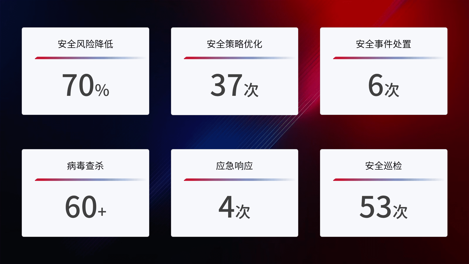 提供全面的安全事件报告体系,,包括处置报告、、、、周报、、季度和年度总结,,,结合持续监控,,帮助客户深入了解网络安全状况。。