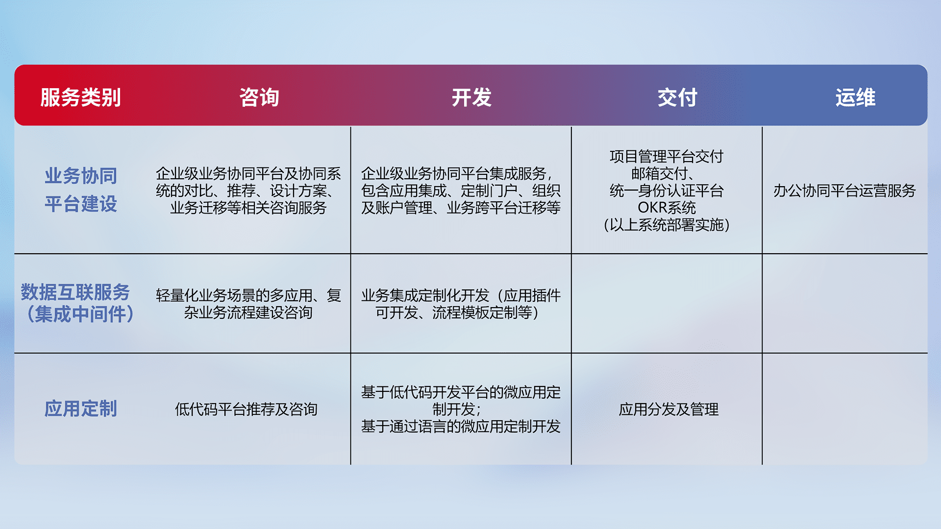针对钉钉、、、、企微、、IDaas等平台级产品提供产品的规划、、、、方案、、交付、、、、定制化开发等服务,,实现如统一协同办公、、、智能客户服务、、、、混合会议管理、、智能数据查询、、、等业务场景,,,,实现数字化转型。。。。