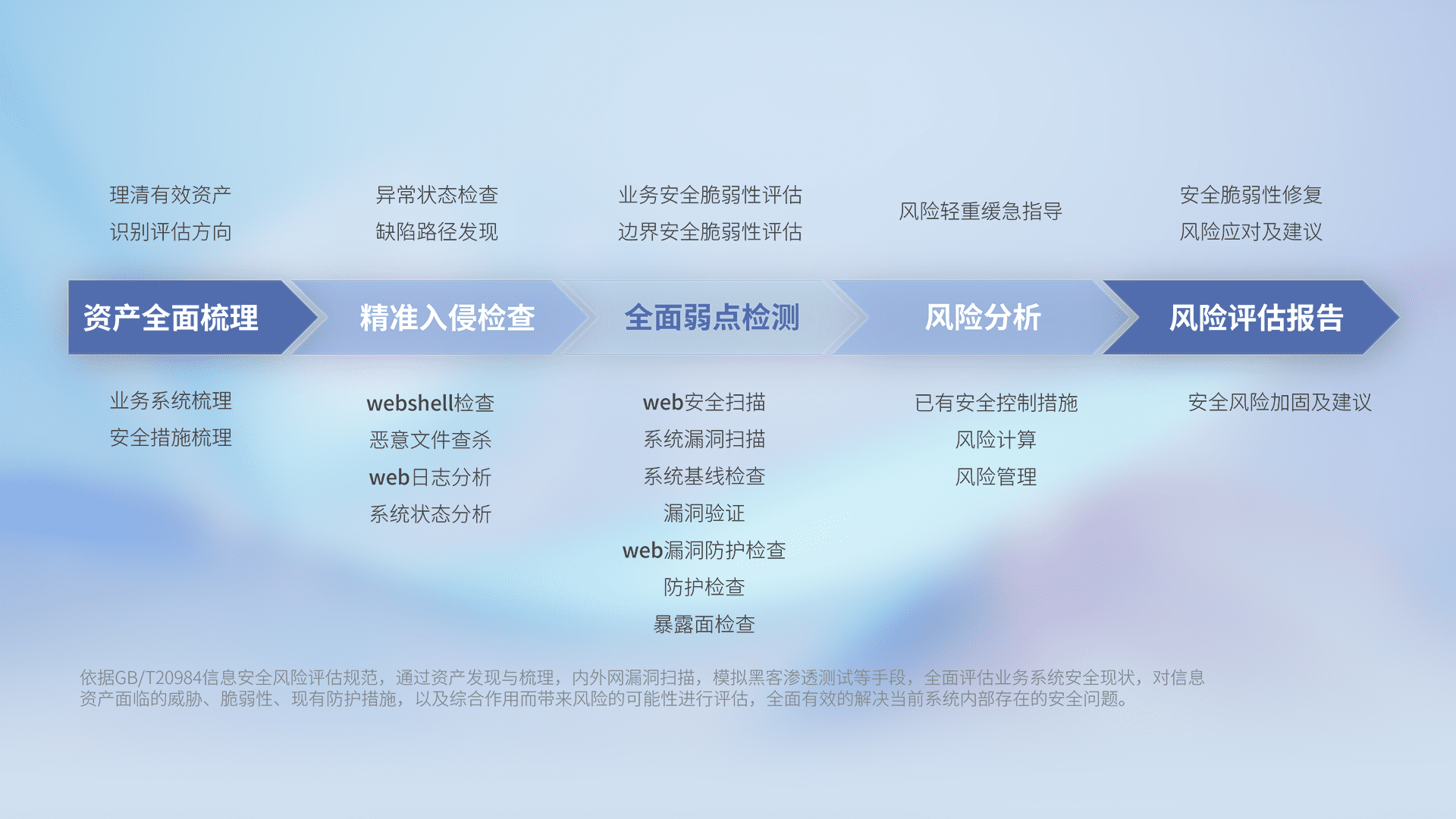 针对客户行业特性,,以专业的安全服务+多厂商联合解决方案提供专属的一站式安全管理服务,,,帮助客户全面感知网络空间威胁,,,基于识别、、、、检测、、、分析、、、防护、、、监测、、、响应的服务理论模型,,,,从方案咨询、、、、集成交付、、、、评估验证、、优化加固、、、、运维运营,,致力于为客户提供完整的闭环管理式安全服务。。。。以实战经验为客户打造高抵御风险的安全体系,,,,帮助客户发现威胁、、、、对抗威胁、、、、处置威胁,,,不断积累安全对抗能力,,,,持续保障数字化安全。。。。